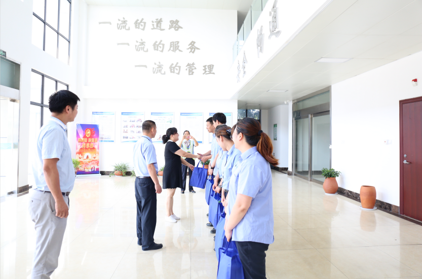 7月28日上午,公司領導班子到各站點慰問了一線員工,在工作現場,領導們為一線收費員送上了夏季清涼用品等慰問品,并親切詢問了一線員工們的作息時間和生活狀況,對大家高溫天氣下堅守崗位的精神表示高度贊揚,同時叮囑大家要做好防暑降溫措施,合理安排休息時間,保持良好的精神狀態,在做好文明服務的同時,確?,F場工作有序暢通。