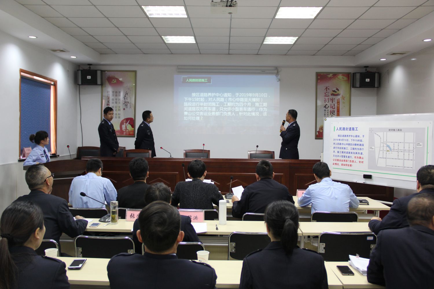 本次比武中,七支參賽隊(duì)伍采用新聞發(fā)布會(huì)的形式,圍繞“人民路部分路段半封閉施工后公交繞行方案”的命題內(nèi)容進(jìn)行相關(guān)計(jì)劃模擬新聞發(fā)布;各參賽隊(duì)隊(duì)員合作默契,思路清晰,以縝密的分析和準(zhǔn)確的敘述,將平日積累的優(yōu)秀營運(yùn)管理技能充分展現(xiàn)出來。為體現(xiàn)比賽的公正、公平,公司還特邀市北交警中隊(duì)副中隊(duì)長王俊杰、區(qū)道路運(yùn)輸管理處辦公室主任戚波波、區(qū)交通運(yùn)輸局運(yùn)管科汪峰、公司董事長、總經(jīng)理張國棟等班子以及相關(guān)部門負(fù)責(zé)人組成評委組,對七支參賽隊(duì)進(jìn)行現(xiàn)場提問和打分。經(jīng)過三個(gè)小時(shí)的激烈角逐,最終三車隊(duì)、六車隊(duì)、四車隊(duì)分別獲得本次演示比武的第一名、第二名及第三名。