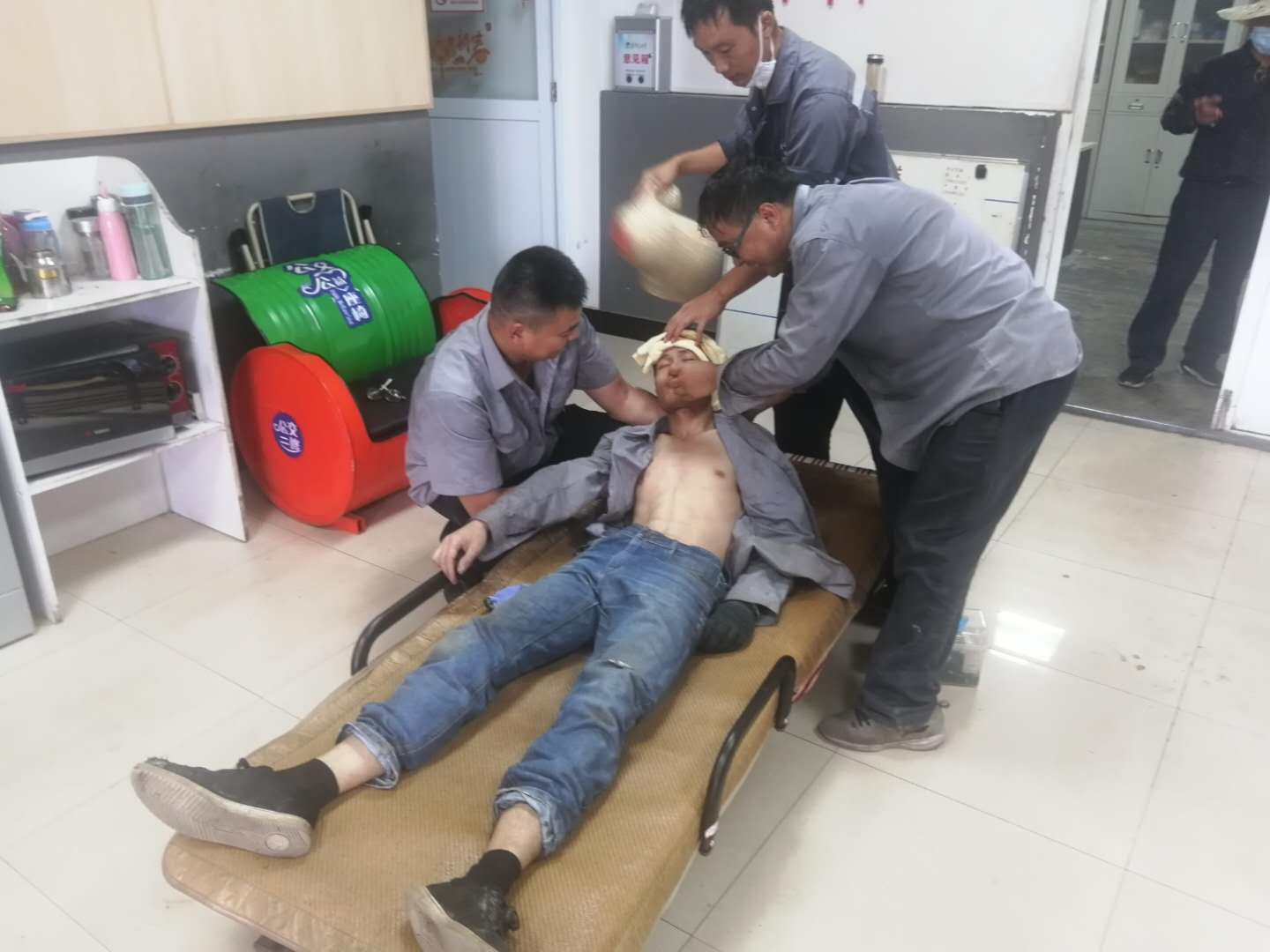 按照演練流程和角色分工,模擬旅客突然中暑暈倒進行應(yīng)急處置演練。演練中,一名修理工在在高溫環(huán)境下車輛維修作業(yè)過程中,出現(xiàn)頭暈現(xiàn)象,并隨后暈倒在地。同事發(fā)現(xiàn)險情后,立即通知班組長,隨后分公司負責(zé)人接到班組長事故報告后,立即啟動應(yīng)急預(yù)案,開展施救工作。現(xiàn)場職工合力將中暑員工抬至陰涼通風(fēng)處,救護組攜帶急救藥箱趕至演習(xí)現(xiàn)場,判斷病情后采用簡單應(yīng)急處置方法,用冷毛巾為中暑人員擦拭身體,解開病員上衣通風(fēng)透氣,用清涼藥品涂抹傷員人中,并給予適量清涼含鹽飲料,使病員快速降溫、補水、醒腦,最后,中暑人員緩慢蘇醒。