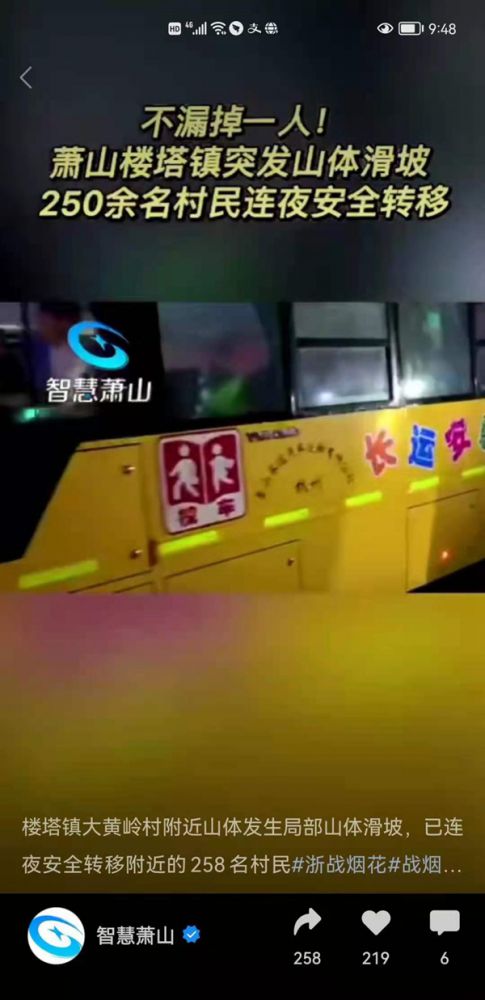 20時30分,樓塔鎮政府聯系巖山小學征用學校校車用于大黃嶺村村民緊急疏散!災情就是命令,時間就是生命!車隊第一時間上報客運分公司,分公司馬上向公司領導匯報,并向交通、行業管理部門報備后,緊急調度巖山小學專用校車趕赴大黃嶺村!家住富陽的徐祖興以及住在當地的樓興平兩位校車司機接到電話后,立即前往救援現場。截止22時46分完成應急疏散任務,將村民安全送到臨時安置點。公司駕駛員樓祖亦,當時正以民兵的身份在現場救援,協助做好相關疏散工作。救援現場緊張有序,天災無情人有情!就像駕駛員徐祖興說的那樣:抗臺救災是每個公民應盡的義務!抗臺救災也是蕭山長運一個國有企業應擔的社會責任!