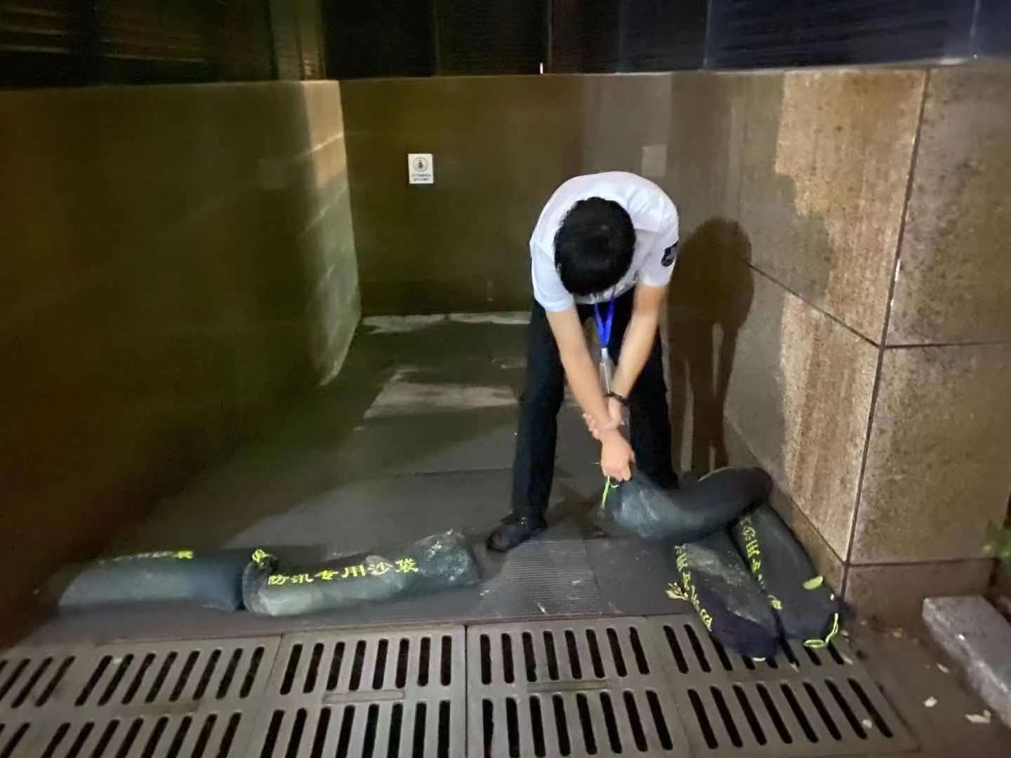 暴雨來臨,疏通下水道,排除積水防止漫灌成為最重要的工程。濱弘物業(yè)人在積水中尋找排水口,疏通排水管道,用防汛沙袋及時封堵出路口,為最大程度阻止雨水溢流車庫。