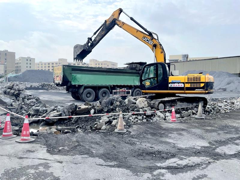 瀝青拌和中心升級改造工程主要是對堆料場地進行封閉改造,因完工時間緊迫,路橋工程公司為最大程度地加快場地升級改造步伐,公司對工程管理采用二條腿“走路”,一邊精簡流程,加快工程前期設計、招標程序;一邊公司自發組織施工機械對堆料場地混凝土擋墻和地坪進行破碎及廢料外運,為8月18日進場施工提供完備的施工條件。