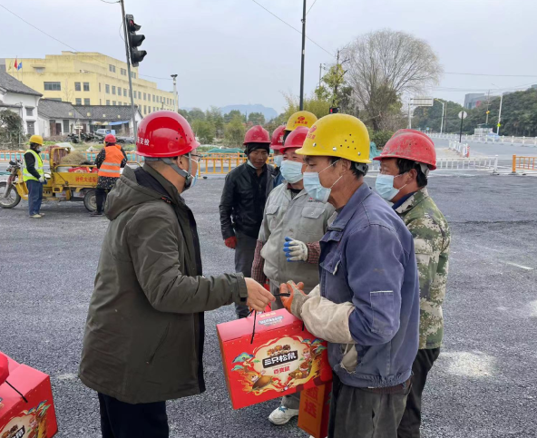 正值團圓的春節(jié)假期,區(qū)交投集團黨委委員、副總經(jīng)理金文華、建管公司副總經(jīng)理、工會主席王國芳對交通建管公司承建的“22688”交通建設項目時代大道改建工程留守的民工進行慰問。