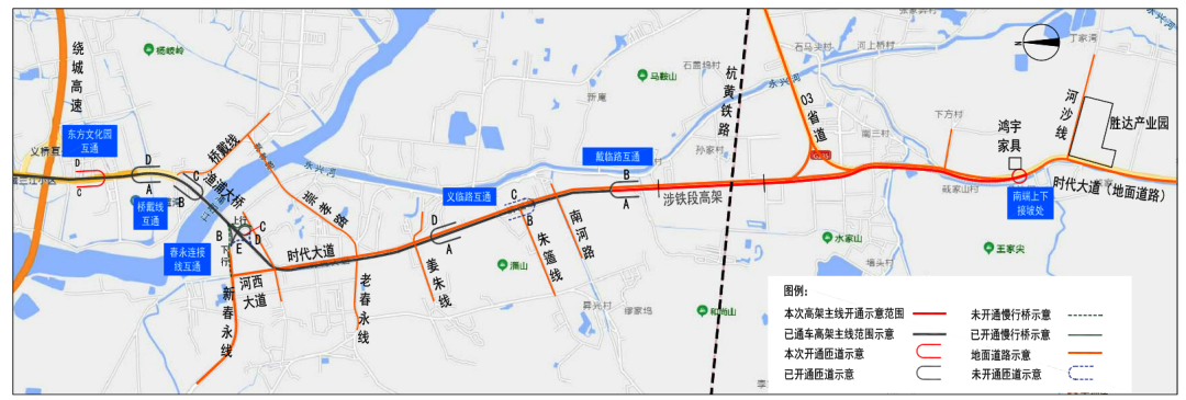 本次擬開通路段為時(shí)代大道南延(繞城至中環(huán)段)工程主線高架、東方文化園互通C、D匝道(約3.4公里),03省道改擴(kuò)建下穿杭黃鐵路高架段(約1.06公里),共計(jì)全長(zhǎng)約4.46公里。其中,東方文化園互通義橋方向上下匝道開通,高架主線保證雙向4車道通行,匝道保證單向一車道通行。