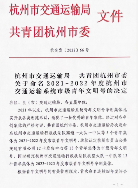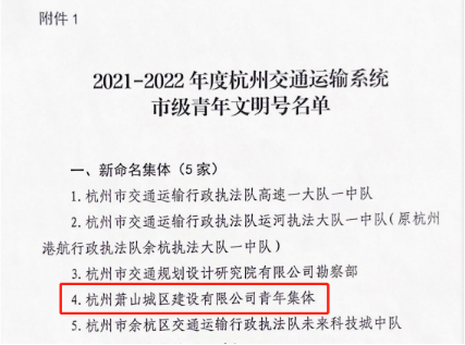 近日,杭州市交通運輸局聯合共青團杭州市委共同下發《關于命名2021-2022年度杭州市交通運輸系統市級青年文明號的決定》, 城區建設公司青年集體榮獲2021-2022年度杭州交通運輸系統市級“青年文明號”。
