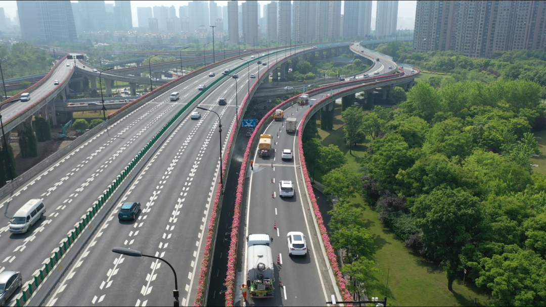 綠化美化提升工程采用的生態(tài)固化種植基質及裝配式立體綠化工藝,克服了高架綠化中普遍存在的安全、揚塵污染、養(yǎng)護成本高等問題,采用不銹鋼鋼架結構和壓力補償式自動滴灌系統(tǒng),規(guī)格統(tǒng)一,裝配便利,經(jīng)久耐用,節(jié)水明顯,實現(xiàn)高架立體綠化景觀效果和管養(yǎng)的最優(yōu)化。