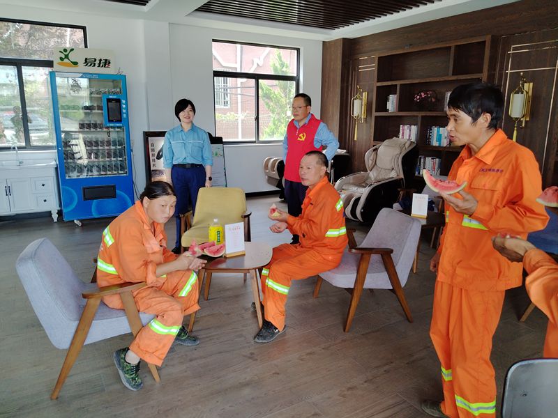 建盈南站的紅運驛站司機之家配備便民服務設備設施,包括飲水設備、按摩椅、空調、小藥箱、手機充電等,室內清涼舒適,為戶外勞動者提供了一個避暑休憩的場所。清甜爽口的西瓜為戶外勞動者們送去了抵抗酷暑的絲絲清涼,貼心的增值服務贏來勞動者們的聲聲贊揚。
