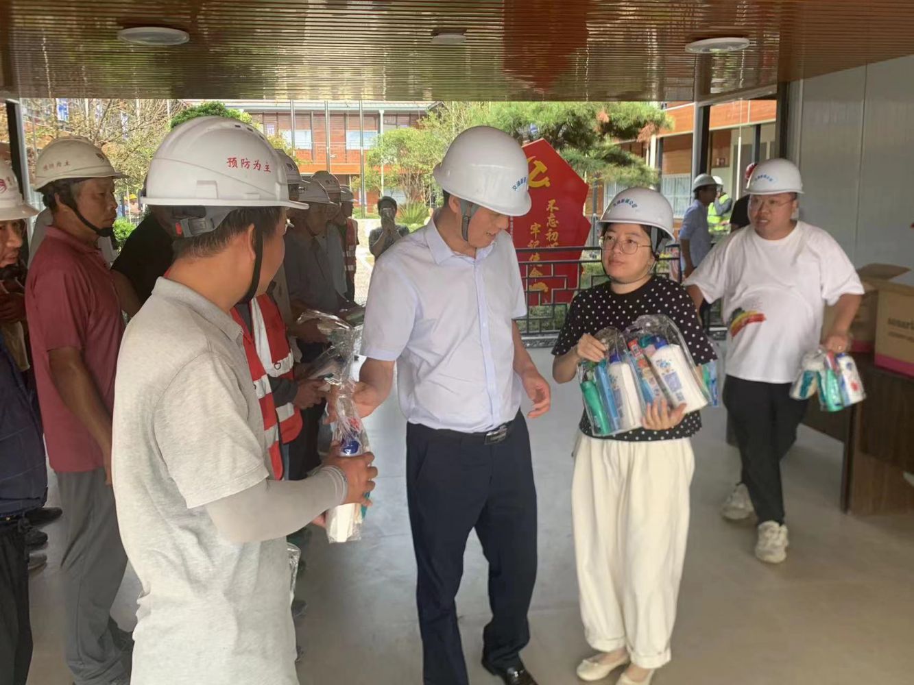 公司黨支部書記邵發(fā)強(qiáng)、副總經(jīng)理金莎帶隊(duì)前往黨灣安置房項(xiàng)目施工現(xiàn)場(chǎng),走訪慰問一線施工人員,向堅(jiān)守崗位的施工人員送上高溫慰問品,感謝他們的堅(jiān)守和付出,為工程項(xiàng)目安全有序推進(jìn)提供了堅(jiān)強(qiáng)保障。同時(shí),叮囑施工單位要切實(shí)關(guān)心一線施工人員,合理安排工人的工作和休息時(shí)間,切實(shí)保障工程質(zhì)量、施工進(jìn)度和生產(chǎn)安全。