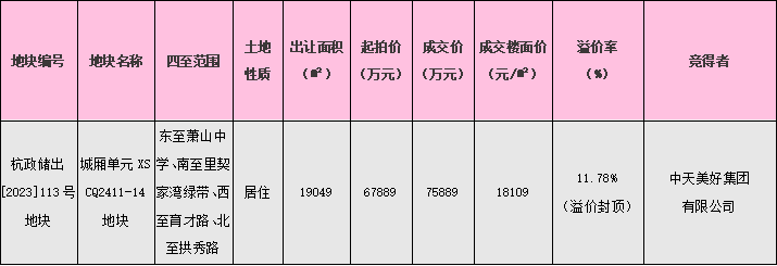 今日,在杭州市規劃和自然資源局蕭山分局、蕭山區住房和城鄉建設局、城廂街道等相關單位的鼎力支持下,由交投集團作為做地主體的城廂單元XSCQ2411-14地塊(杭政儲出[2023]114號地塊)未開拍已封頂,經過16輪報價,在掛牌期間就達到上限價格75889萬元,樓面價18109元/㎡,溢價率11.78%。線下搖號環節,共有25家房企參與搖號,最終由中天美好集團有限公司搖號競得該地塊!