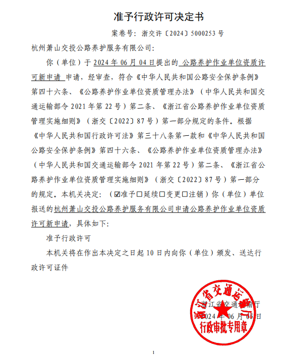 7月10日,交投養(yǎng)護(hù)公司順利通過(guò)省交通運(yùn)輸廳審批,成功取得公路養(yǎng)護(hù)作業(yè)路基路面乙級(jí)資質(zhì)。我司,把提升資質(zhì)作為公司的重要戰(zhàn)略目標(biāo)。此次資質(zhì)申報(bào),相關(guān)科室從5月底開(kāi)始著手,按上級(jí)部門(mén)要求,將所需材料收集整理并上傳系統(tǒng),將紙質(zhì)版資料送至浙江省交通運(yùn)輸廳相關(guān)部門(mén)審核,