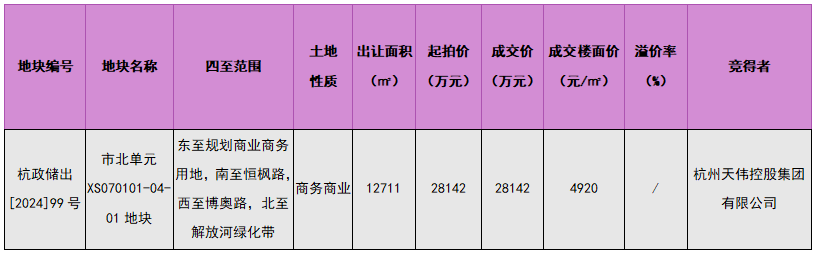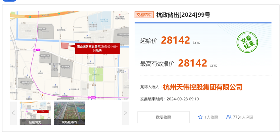 9月23日,由蕭山交投集團聯合蕭山經濟技術開發區管委會招商做地的杭政儲出[2024]99號(蕭山城區市北單元XS070101-04-01地塊)總部企業項目地塊順利完成出讓!由杭州天偉控股集團有限公司以總價28142萬元的價格競得。