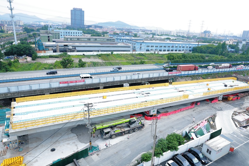 彩虹快速路東延工程起于03省道東復(fù)線,終于組團(tuán)環(huán)線東段,全長約4.8公里,其中主線高架約4.5公里。工程按一級公路兼顧城市道路標(biāo)準(zhǔn)設(shè)計,采用“高架橋+地面道路”形式,設(shè)置雙向6車道,高架橋設(shè)計速度80公里/小時,地面道路設(shè)計速度60公里/小時。目前,項(xiàng)目正準(zhǔn)備開展大治河北輔道橋鋼箱梁頂推施工,力爭6月底前北側(cè)輔道全線貫通。
