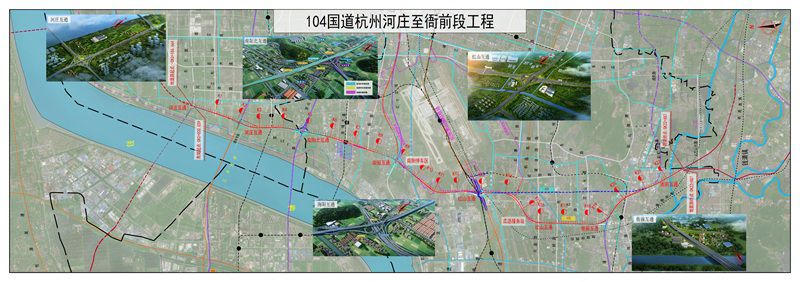 104國道杭州河莊至衙前段工程主線起點位于杭州錢塘區河莊街道,規劃濱江二路與江東三路交叉處,路線向南延伸,經南陽街道、紅山農場、瓜瀝鎮,終于杭州紹興交界處衙前鎮,與104國道紹興段順接,路線全長約22.8公里(其中蕭山段長約18.1公里)。工程按一級公路標準設計建設,采用“高架橋結合地面道路”形式,高架橋設計速度80公里/小時,地面道路設計速度60公里/小時。目前,一階段工程已完成總進度的35%。 |