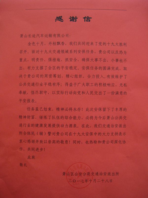 感謝信中提到,“面對十九大交通領域系列安保任務,貴公司以反恐為重點,明責任、強措施、抓安全,確保大事不出,小事也不出,有力支撐了全區的平安穩定。安保任務的圓滿完成,取決于貴公司的周密籌劃,精心組織,全力投入,有效維護了公共交通行業平穩有序;得益于廣大職工的積極響應,無私奉獻,恪盡職守,以實際行動向黨和人民交出了一份滿意的平安報表”。