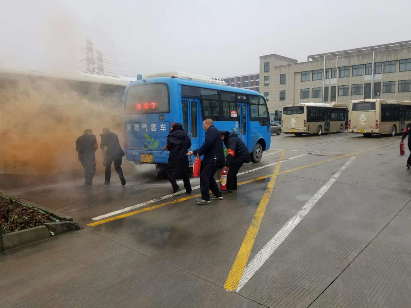9時(shí)40分,場(chǎng)區(qū)啟動(dòng)停車場(chǎng)消防應(yīng)急預(yù)案。9時(shí)41分,場(chǎng)站保安人員發(fā)現(xiàn)臨浦中心站東南區(qū)塊濃煙滾滾,迅速拉響警鈴,同時(shí)通知在場(chǎng)人員火警情況;9時(shí)42分,車隊(duì)人員、物業(yè)人員、修理廠人員以及保安人員迅速趕至起火點(diǎn)開展滅火自救并由車隊(duì)長(zhǎng)進(jìn)行現(xiàn)場(chǎng)指揮,9時(shí)46分,消防水帶出水,9時(shí)47分“火勢(shì)”撲滅,警報(bào)解除。演習(xí)取得預(yù)期效果。