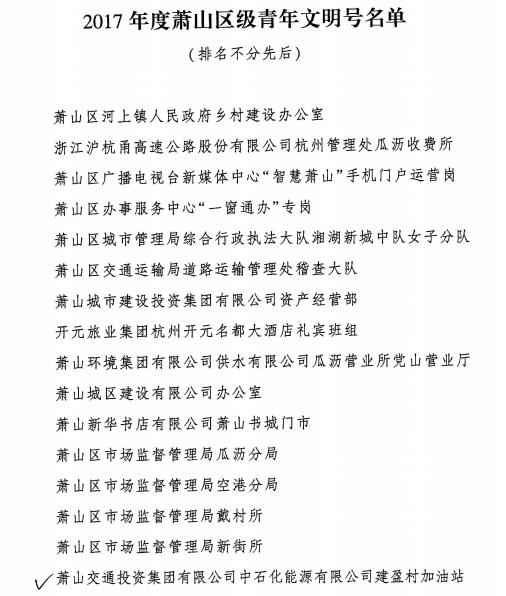 交投能源公司建盈加油站廣大青年立足崗位、團(tuán)結(jié)奮進(jìn)、助人為樂(lè)、無(wú)私奉獻(xiàn),積極開(kāi)展“青年文明號(hào)”創(chuàng)建活動(dòng),用青春的誓言,扎實(shí)的行動(dòng),贏得公司領(lǐng)導(dǎo)及到站顧客的信賴。近日,榮獲蕭山團(tuán)區(qū)委授予的“2017年度蕭山區(qū)級(jí)青年文明號(hào)”稱號(hào)。