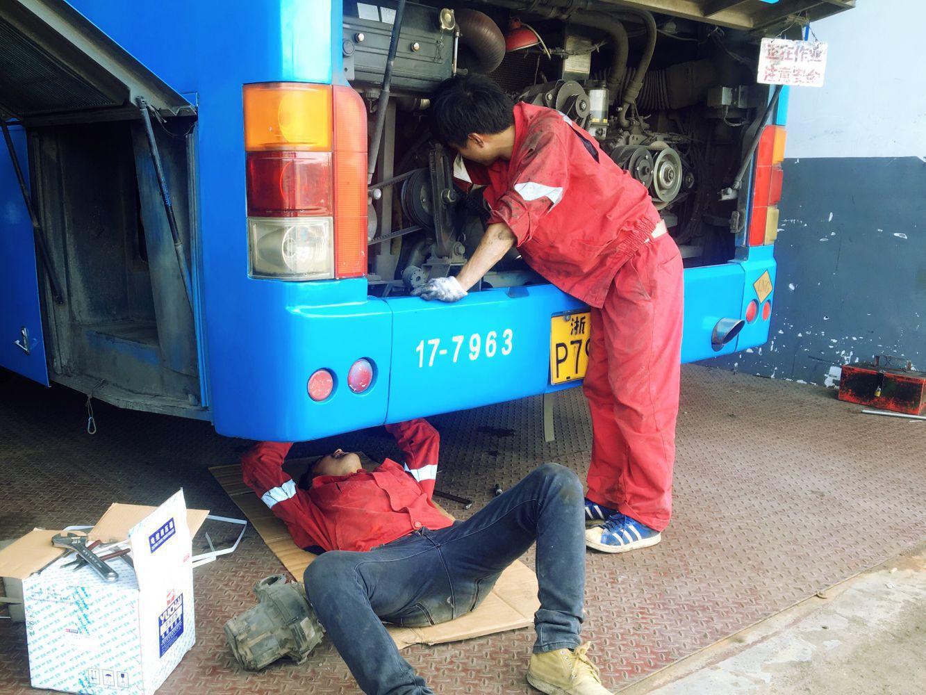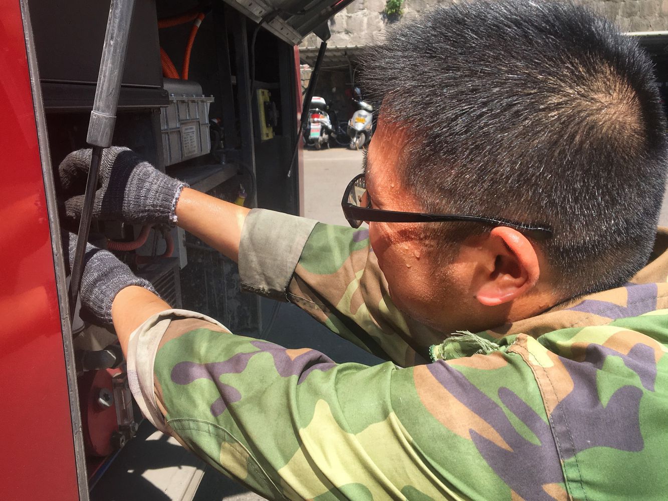 站在室外,撲面而來的熱浪已是熱的人喘不過氣,但如果說人們面對(duì)的是40度,那么修理工們面對(duì)的將是常人無法想象的60度甚至70度。為使車輛盡快恢復(fù)運(yùn)行,他們每天都穿著又悶又厚的工作服,在彌漫著刺鼻機(jī)車味的車間里鉆進(jìn)滿是油污的地溝。因?yàn)楣ぷ餍枰?、必須趁著高溫進(jìn)行檢修,他們往往顧不上滾滾的熱浪,對(duì)著滾燙的零部件一修就是幾小時(shí),從頭到腳、從里到外,濕了又干、干了又濕,每個(gè)人衣服上都結(jié)著一層層白色的鹽霜。一天作業(yè)下來幾乎去不到一次廁所,因?yàn)楹鹊魩咨乃讶孔兂闪撕?。然而就算再忙再熱,他們也依然得保持?xì)心和耐心,因?yàn)槊恳粋€(gè)問題都隱藏在細(xì)小的零件中。難道他們不覺得熱嗎?一位老師傅回答道:“熱啊,我們也是普通人,怎么不熱?但我們既然在這個(gè)崗位,就得積極面對(duì)工作,如果人人都不愿干,那誰來保證公交的有序運(yùn)行呢?”。