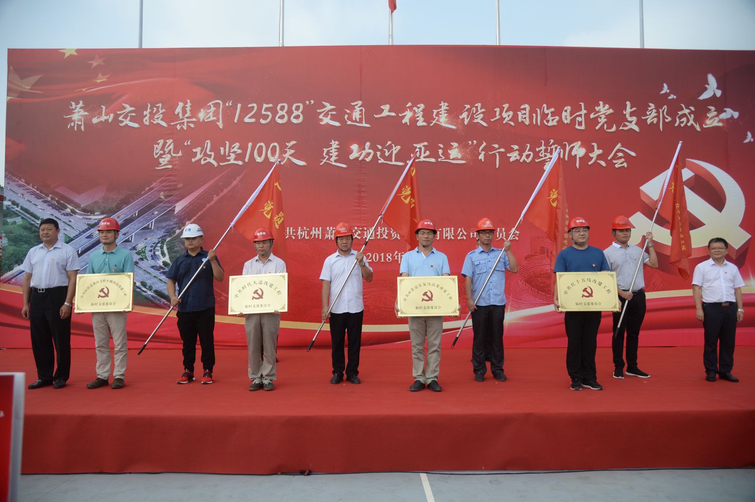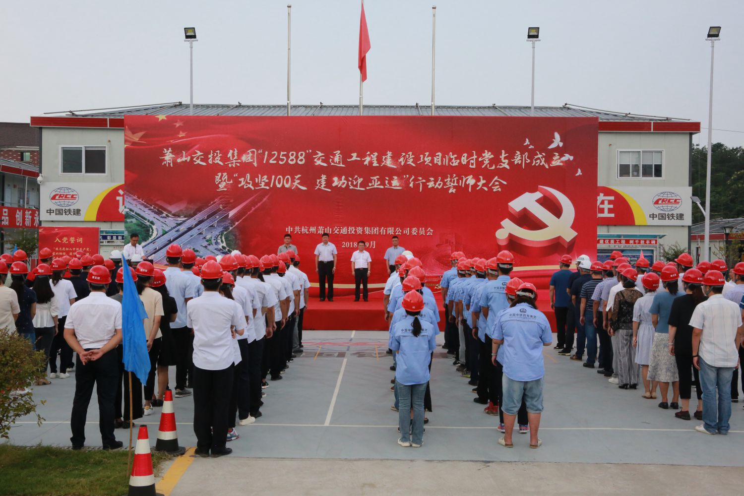 為貫徹落實(shí)黨的十九大和蕭山區(qū)委全會(huì)精神,落實(shí)全面從嚴(yán)治黨總要求,堅(jiān)持“黨的一切工作到支部”的理念,發(fā)揮基層黨支部的主體作用,搶抓秋冬季施工“黃金”時(shí)節(jié),奮戰(zhàn)100天確保完成全年目標(biāo)任務(wù),9月14日上午,集團(tuán)在時(shí)代大道改建工程二標(biāo)項(xiàng)目部舉行“12588”交通工程項(xiàng)目臨時(shí)黨支部成立暨“攻堅(jiān)100天建功迎亞運(yùn)”行動(dòng)誓師大會(huì)。