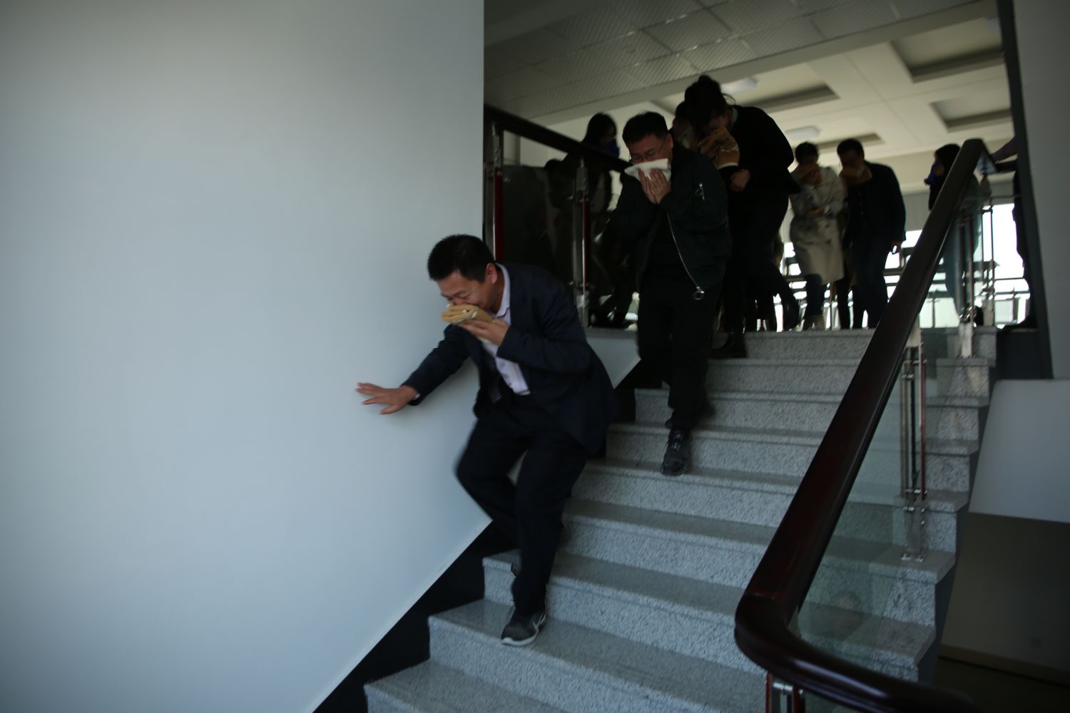 15時(shí)37分,培訓(xùn)現(xiàn)場(chǎng)模擬火情發(fā)生,現(xiàn)場(chǎng)指揮人員發(fā)出疏散指令。安全員吹響哨子、手持小紅旗在前引路,參與演練人員用濕毛巾捂住口鼻,依次順著疏散樓梯右側(cè)向下撤離至大樓室外廣場(chǎng)。整個(gè)撤離過程緊張、安全、有序,從發(fā)出疏散指令到人員全部撤離至大樓室外廣場(chǎng),用時(shí)2分05秒。