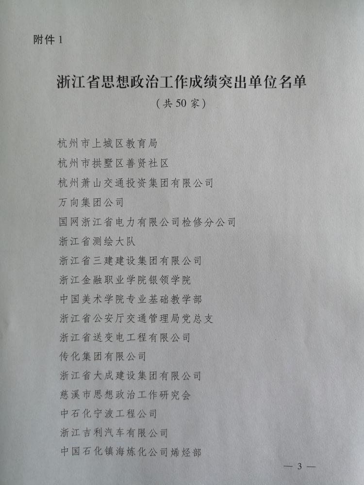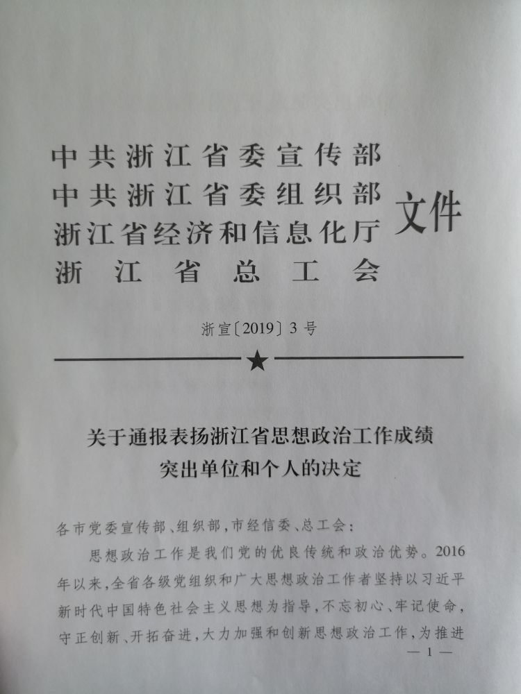 經(jīng)最終評定,榮獲“浙江省思想政治工作成績突出單位”。