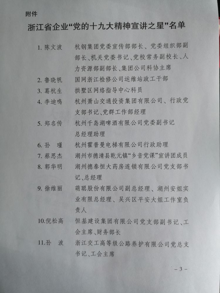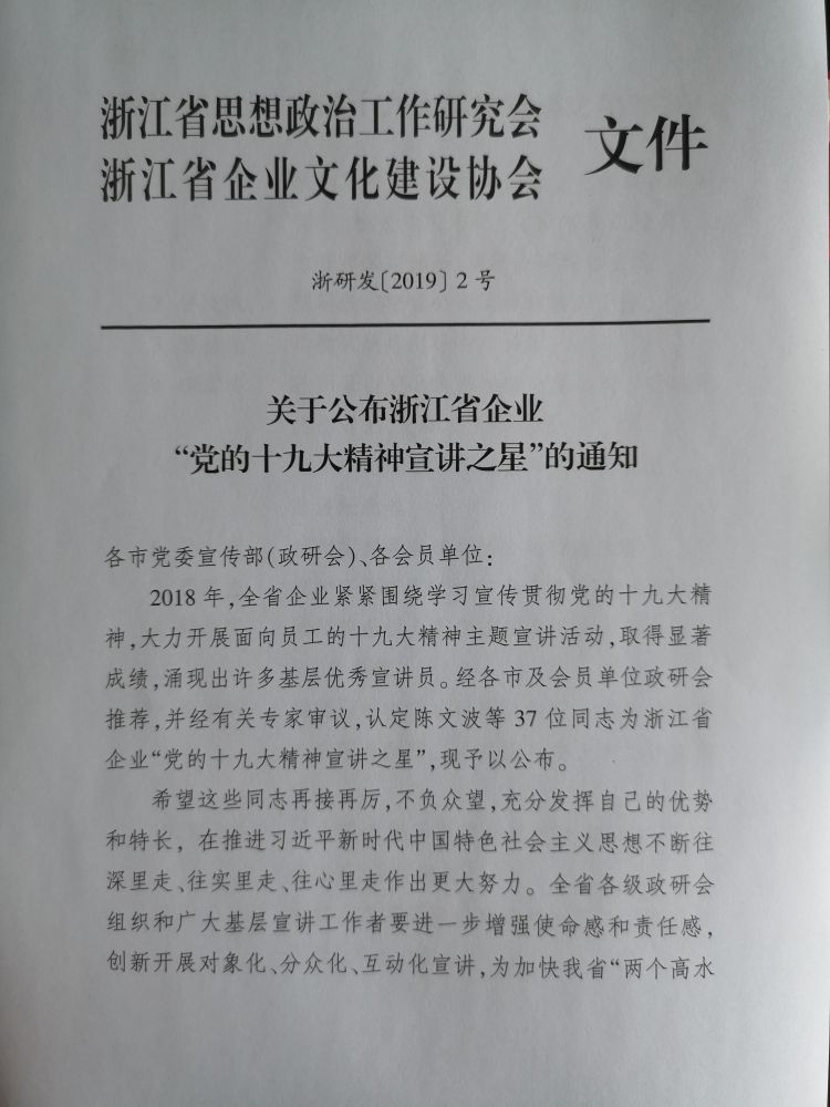 此外,集團(tuán)行政黨支部書記、黨群工作部經(jīng)理李迪鳴榮獲浙江省企業(yè)“黨的十九大精神宣講之星”稱號,全省共37位同志獲此殊榮。